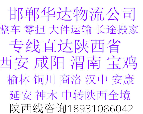 ★ 本站所l列邯鄲到榆林貨運(yùn)專線費(fèi)用與時(shí)效僅供參考,如需詳細(xì)了解最低資費(fèi)請電話咨詢。